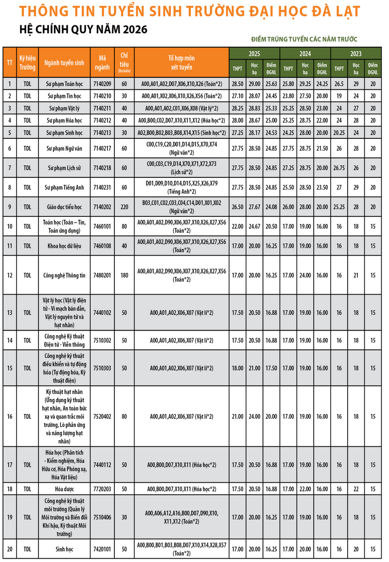 | 3 | 7140210 | Sư phạm Tin học | Môn Toán*2 (bắt buộc) + 1 trong các môn: Vật lý, Hóa học, Sinh học, Tiếng Anh, Tin học, Công nghệ | Toán nhân hệ số 2 |