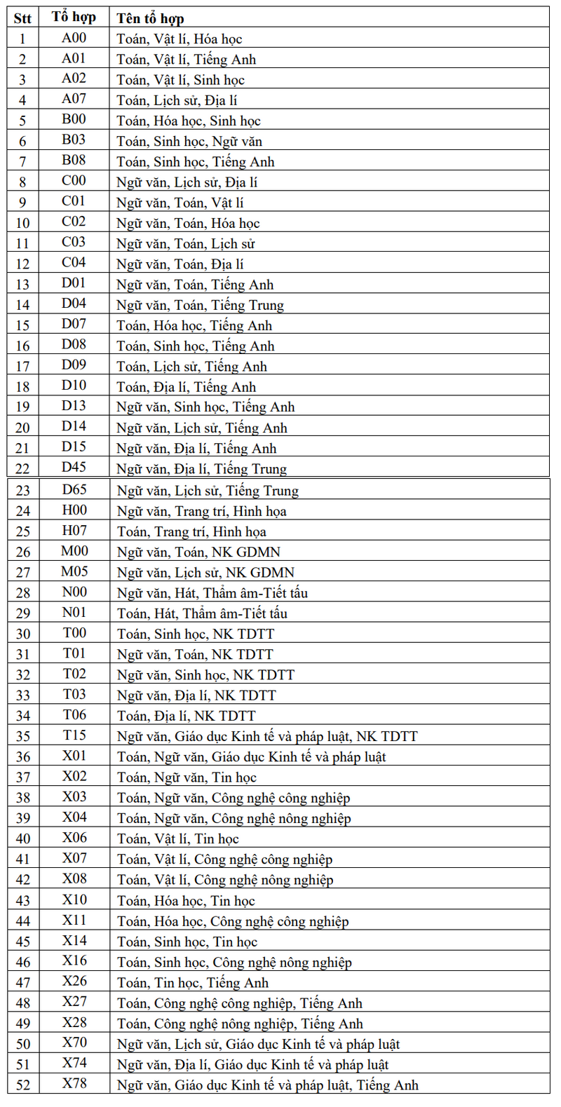 | STT | Mã ngành | Tên ngành | Tổ hợp | Ghi chú |