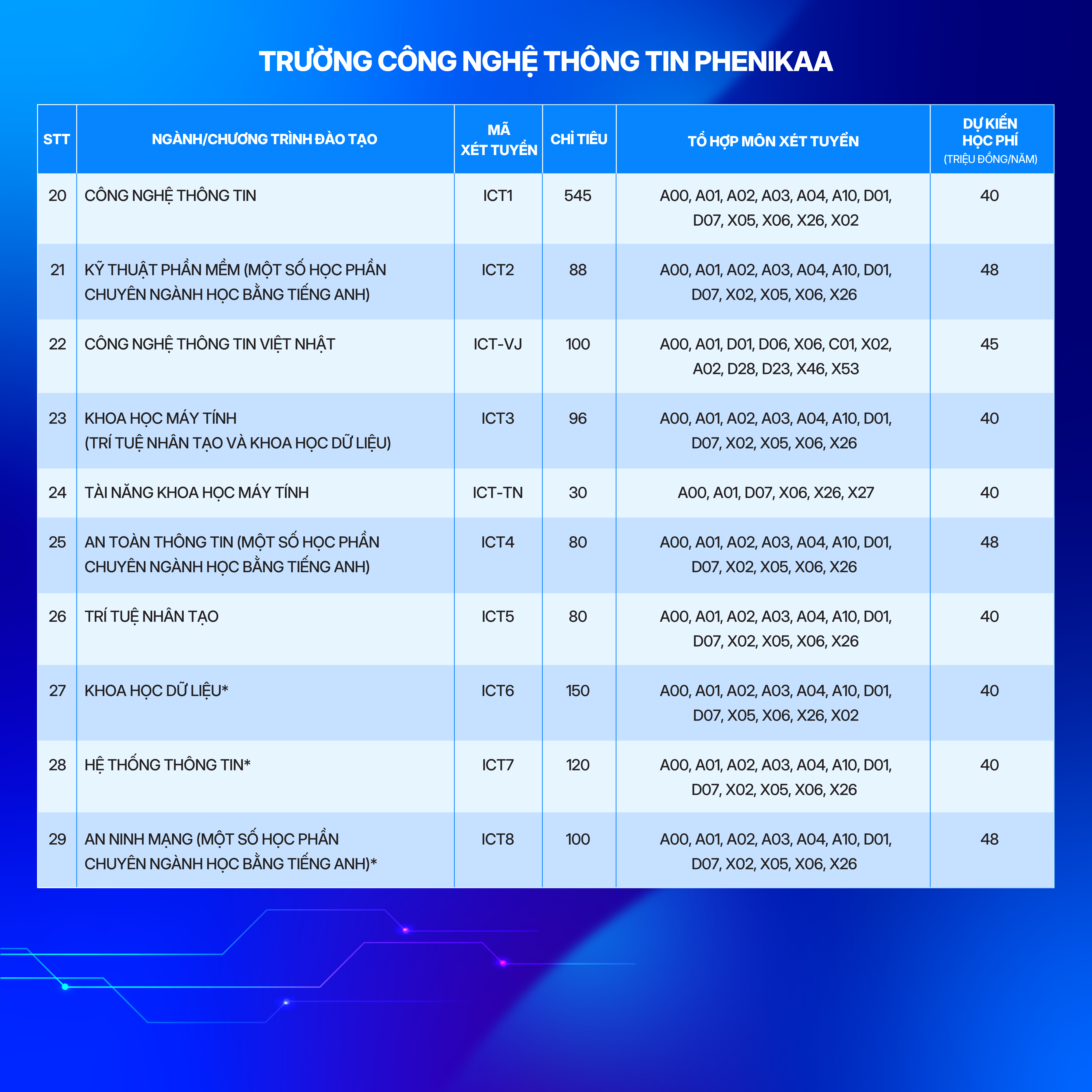 | 22 | ICT1 | Công Nghệ Thông Tin | A00; A01; D01; D07; X06; X26 | |