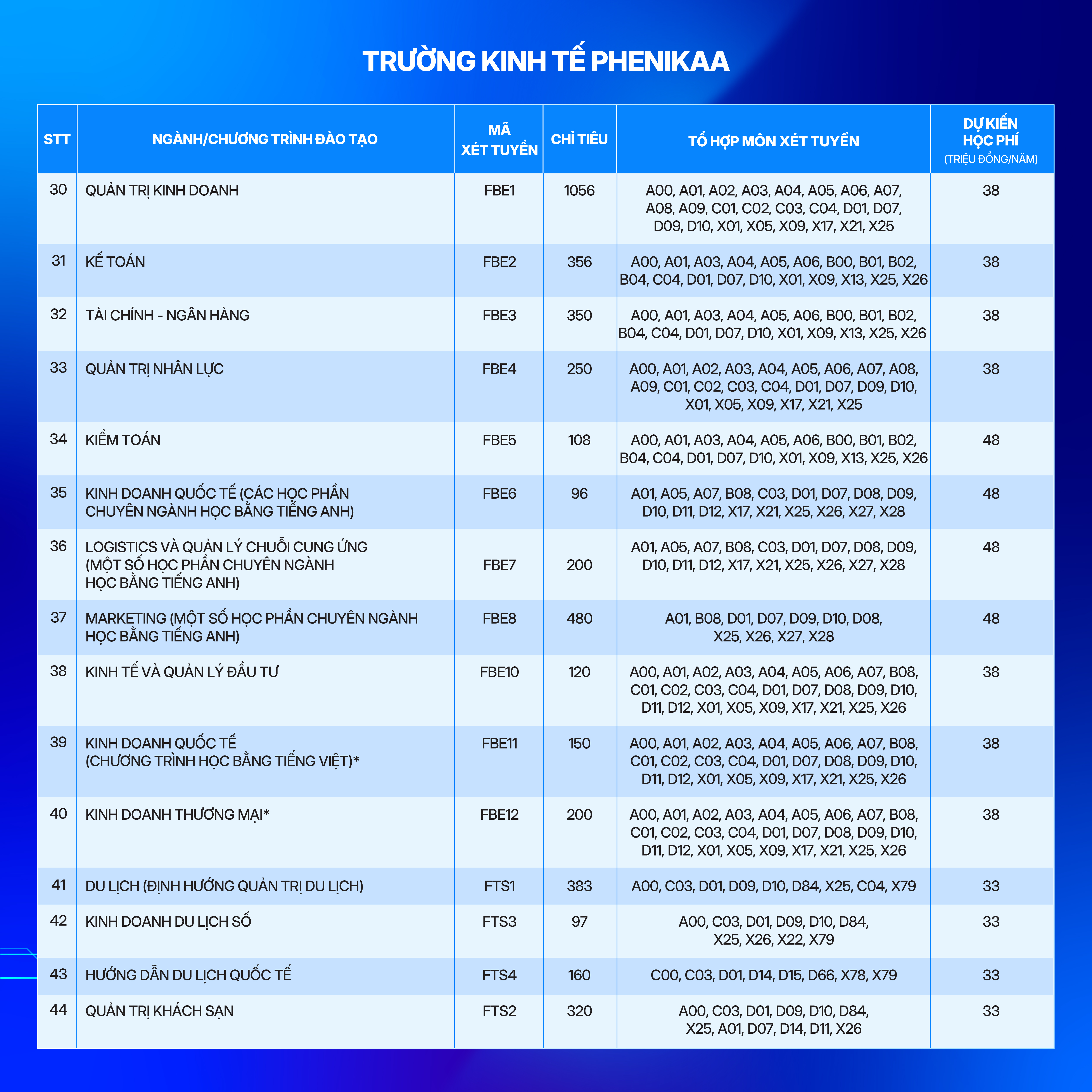 | 31 | FBE10 | Kinh Tế Và Quản Lý Đầu Tư* | A00; A01; A07; A08; D01; D07; X17 | |
