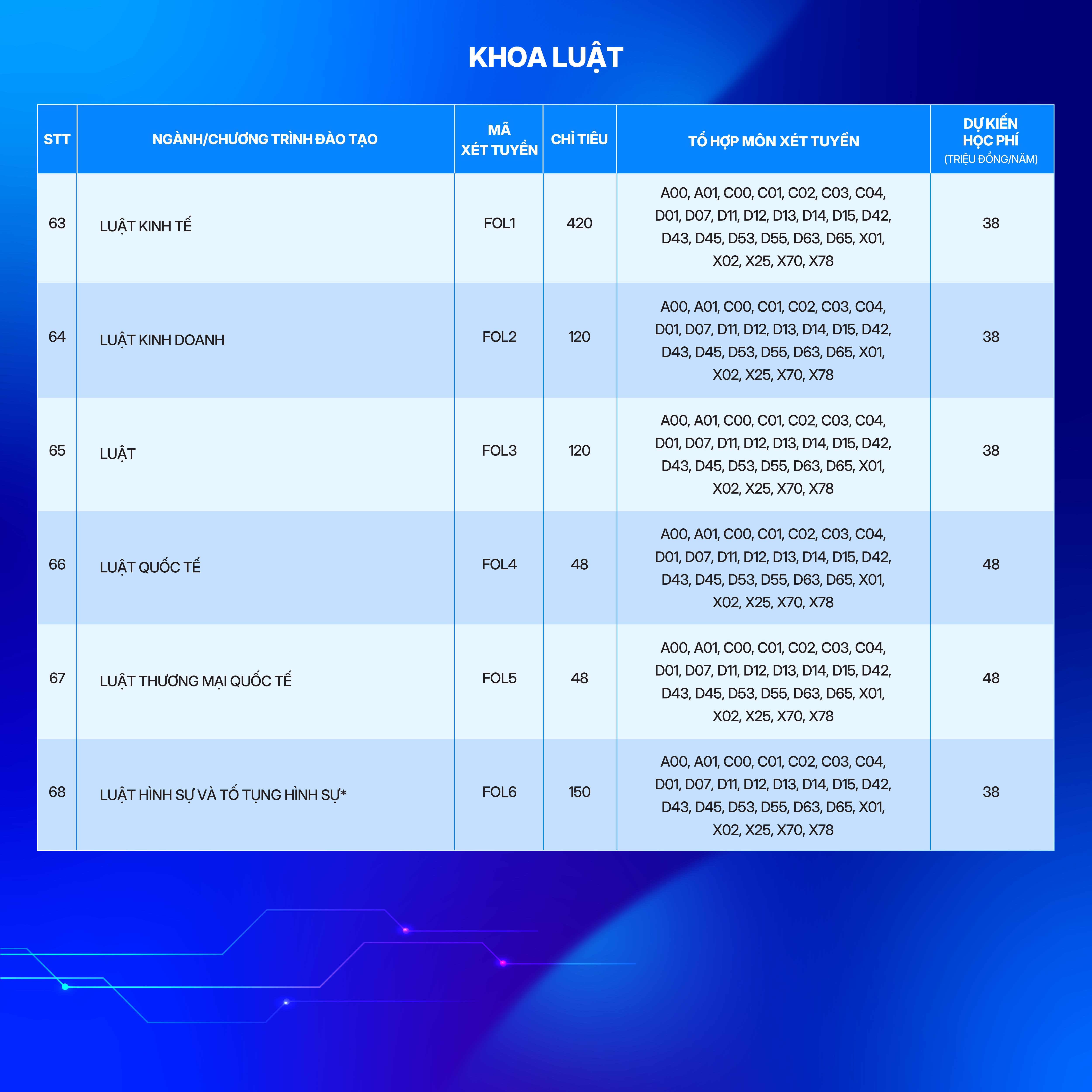 | 63 | FOL1 | Luật Kinh Tế | C00; C03; C19; D01; D12; D13; X70 | |