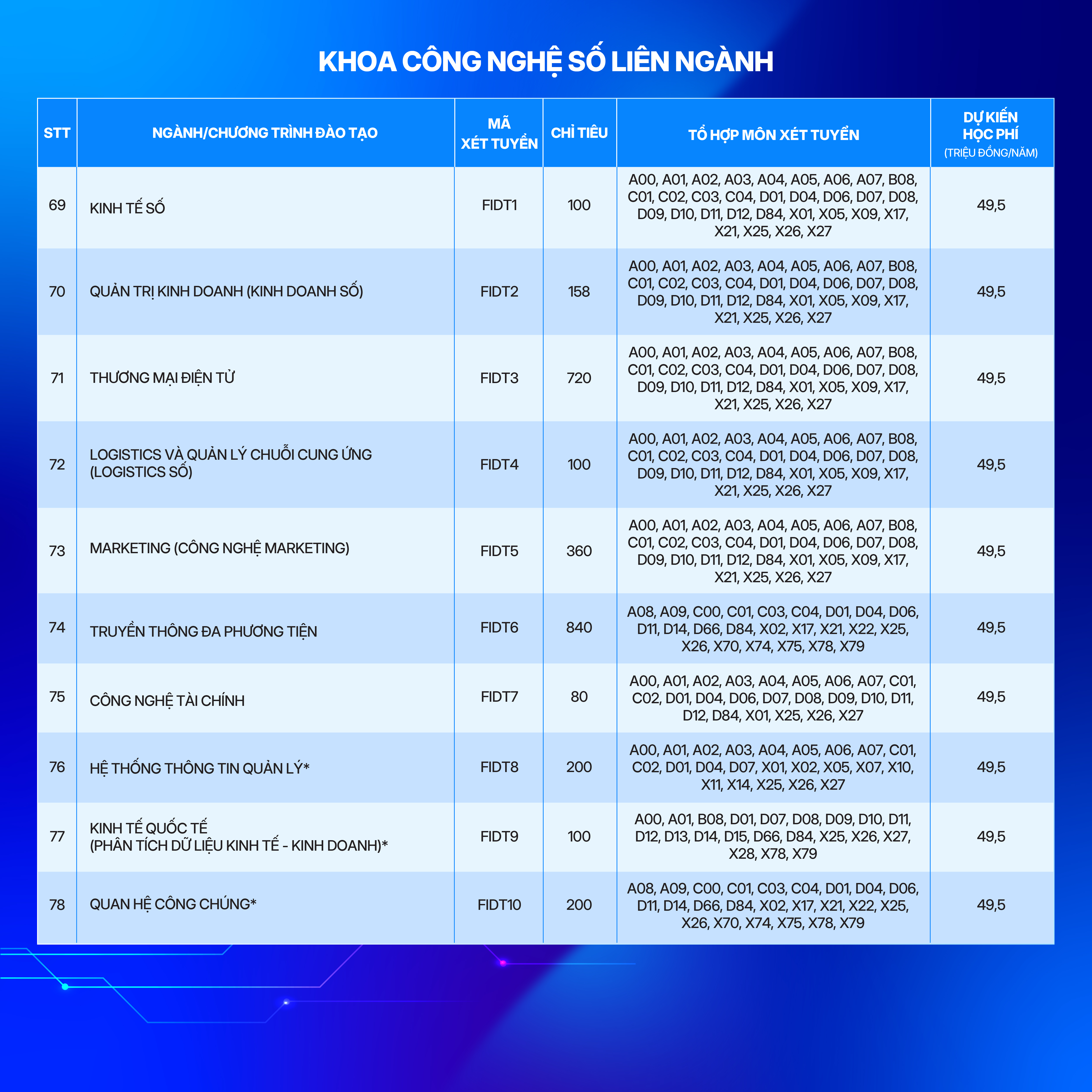 | 68 | FIDT1 | Kinh Tế Số | A00; A01; D01; D84; X25; X26; X27 | |