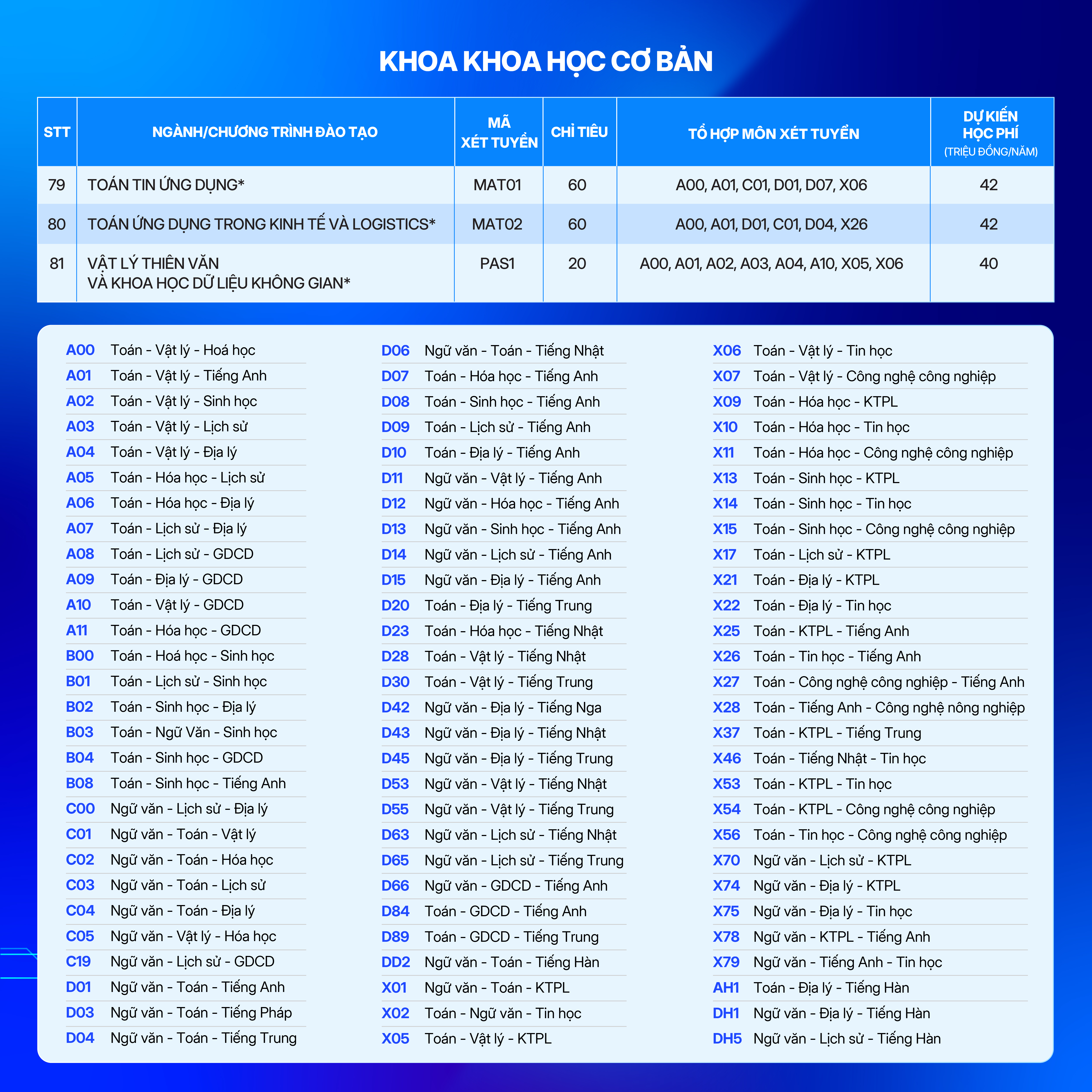 | 80 | PAS1 | Vật Lý Thiên Văn Và Khoa Học Dữ Liệu Không Gian* | A00; A01; A02; A03; A04; A10; X05 | |