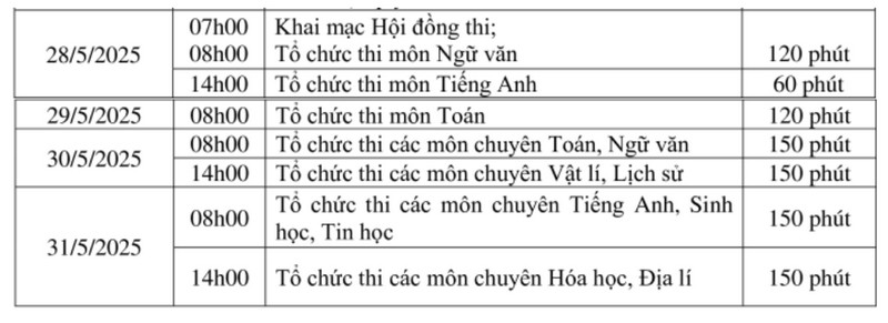 - Thời gian làm bài thi các môn không chuyên: Các môn Toán và môn Ngữ văn 120 phút; môn tiếng Anh 60 phút;