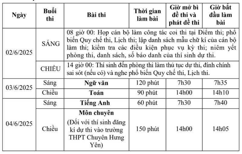 - Nội dung thi: Nằm trong chương trình giáo dục phổ thông cấp trung học cơ sở theo Chương trình giáo dục phổ thông 2018 do Bộ Giáo dục và Đào tạo ban hành, chủ yếu là chương trình lớp 9. (Cấu trúc định dạng đề thi các môn thi theo Công văn số 425/ SGDĐT- QLCL ngày 26/02/2025 của Sở GDĐT về việc thông báo Cấu trúc định dạng đề thi các môn thi Kỳ thi tuyển sinh vào lớp 10 THPT tỉnh Hưng Yên năm học 2025- 2026)
