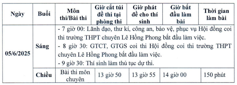 01 bài thi môn chuyên: thi tại Trường THPT chuyên Lê Hồng Phong (ngày 05/6/2025).