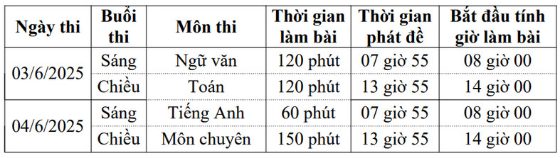 - Thời gian làm bài thi của các môn Ngữ văn, Toán là 120 phút; môn Tiếng Anh là 60 phút; các môn chuyên là 150 phút.