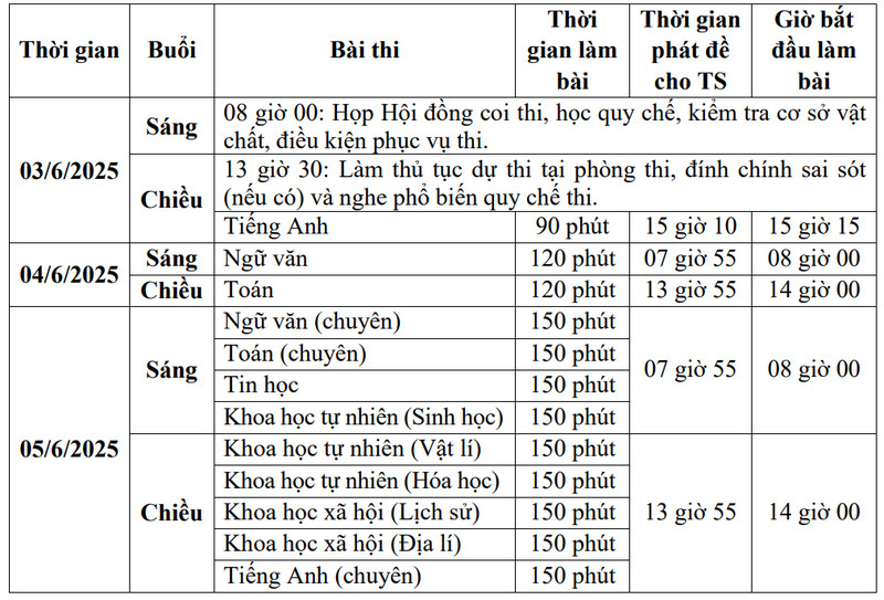 - Môn chuyên: Bài thi môn Tiếng Anh kết hợp tự luận và trắc nghiệm; bài thi môn Tin học lập trình trên máy tính, các bài còn lại thi tự luận. Thời gian 150 phút/bài thi.