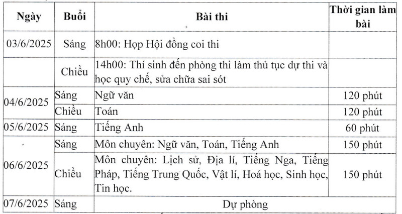 - Thời gian làm bài: Môn không chuyên: Toán, Ngữ văn: 120 phút/môn, môn tiếng Anh: 60 phút. Môn thi chuyên: 150 phút/môn.