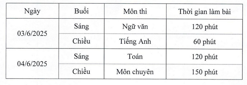 Thời gian làm bài thi chuyên là 150 phút/môn. Riêng môn chuyên Tin học làm bài thi lập trình trực tiếp trên máy vi tính, môn chuyên tiếng Anh có thêm phần nghe hiểu. Kỳ thi dự kiến diễn ra trong 2 ngày 3 và 4/6.