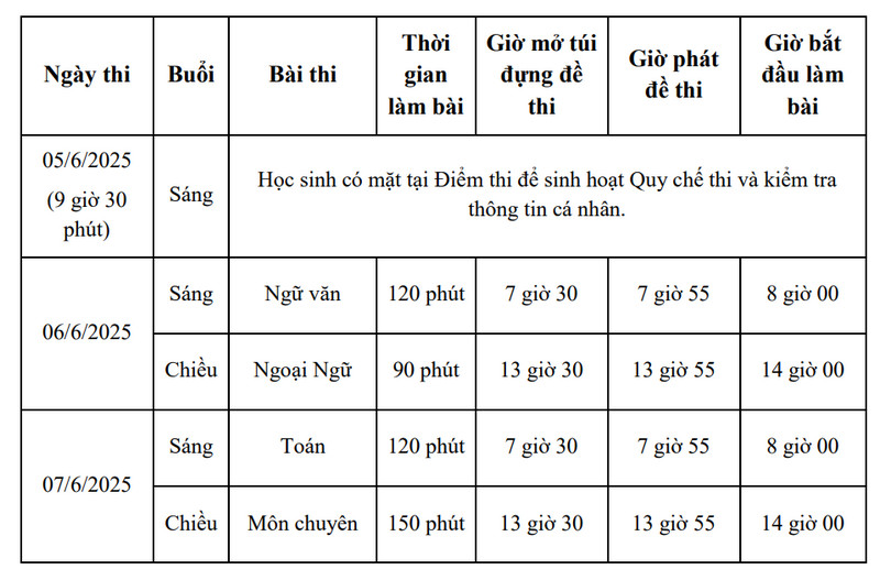 Thông tin được Sở công bố ngày 6/2. Thí sinh làm bài thi Toán, Văn với thời gian 120 phút và Ngoại ngữ (chủ yếu là Tiếng Anh) trong 90 phút.