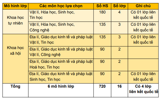 | Khoa học tự nhiên (KHTN) Ký hiệu là các lớp A | Phù hợp với HS có tố chất học tốt các môn KHTN, chắc kiến thức KHTN từ cấp THCS; phù hợp với HS lựa chọn nhóm nghề nghiên cứu, kỹ thuật, nghiệp vụ (6 nhóm nghề theo trắc nghiệm Holland) | ưu: nhiều cơ hội lựa chọn nghề và chọn trường Nhược: chắc kiến thức KHTN từ cấp THCS, CT học nặng hơn KHXH |