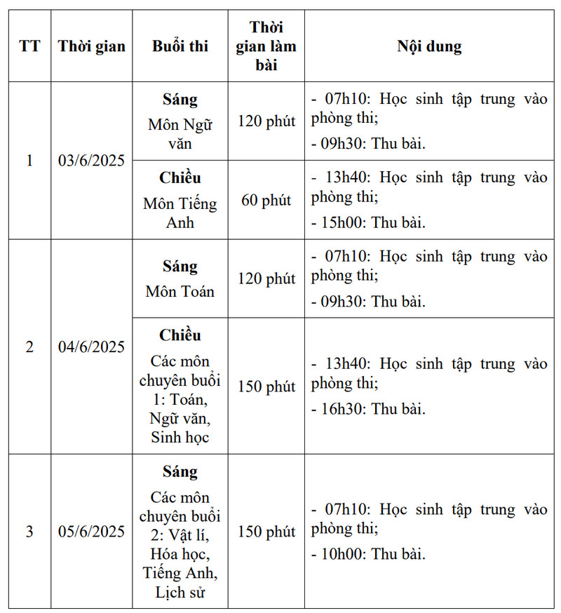 - Thi 04 môn gồm: 03 môn thi chung (Toán, Ngữ văn, Tiếng Anh) và môn chuyên (nếu học sinh đăng ký 01 nguyện vọng môn chuyên);