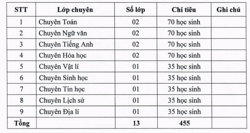 Tuyển 13 lớp chuyên, tổng 455 học sinh (mỗi lớp không quá 35 học sinh) gồm: chuyên Toán 02 lớp; chuyên Ngữ văn 02 lớp; chuyên Tiếng Anh 02 lớp; chuyên Hóa học 02 lớp; chuyên Vật lí 01 lớp; chuyên Sinh học 01 lớp; chuyên Tin học 01 lớp; chuyên Lịch sử 01 lớp, chuyên Địa lí 01 lớp.