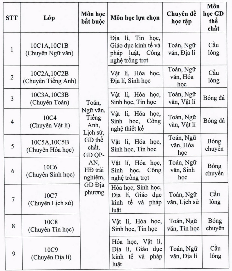 Lớp chuyên và tổ hợp môn học lựa chọn: