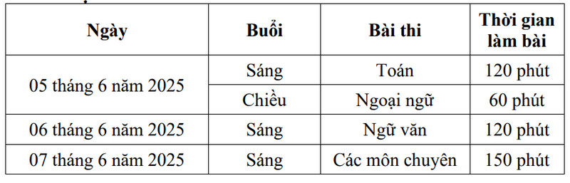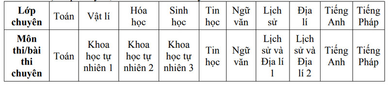 Trường hợp môn chuyên là Ngữ văn, Toán hoặc Ngoại ngữ (Tiếng Anh hoặc Tiếng Pháp) thì thí sinh phải thi 02 bài thi: 01 bài thi môn không chuyên và 01 bài thi môn chuyên. Bài thi môn chuyên có mức độ yêu cầu cao hơn bài thi môn không chuyên.
