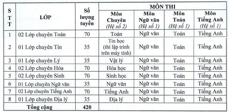 - Đối với lớp chuyên Toán, lớp chuyên Hóa, lớp chuyên Sinh và lớp chuyên Tiếng Anh: Nếu số thí sinh đăng ký dự thi dưới 90 học sinh thì trường chỉ tuyển sinh một lớp (35 học sinh).